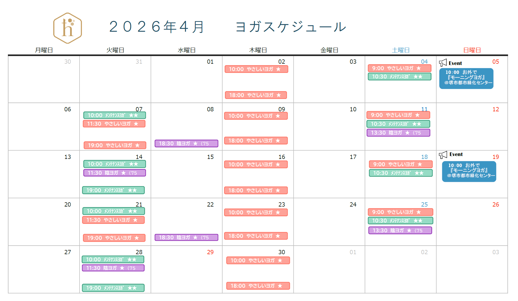 ヨガの基本となるハタヨガをメインにしたベーシックのクラスから、少し運動量のあるメンテナンスヨガのクラス、またポーズをキープする時間をとることで骨や組織の結合織に働きかける陰ヨガのクラスを行っています。
